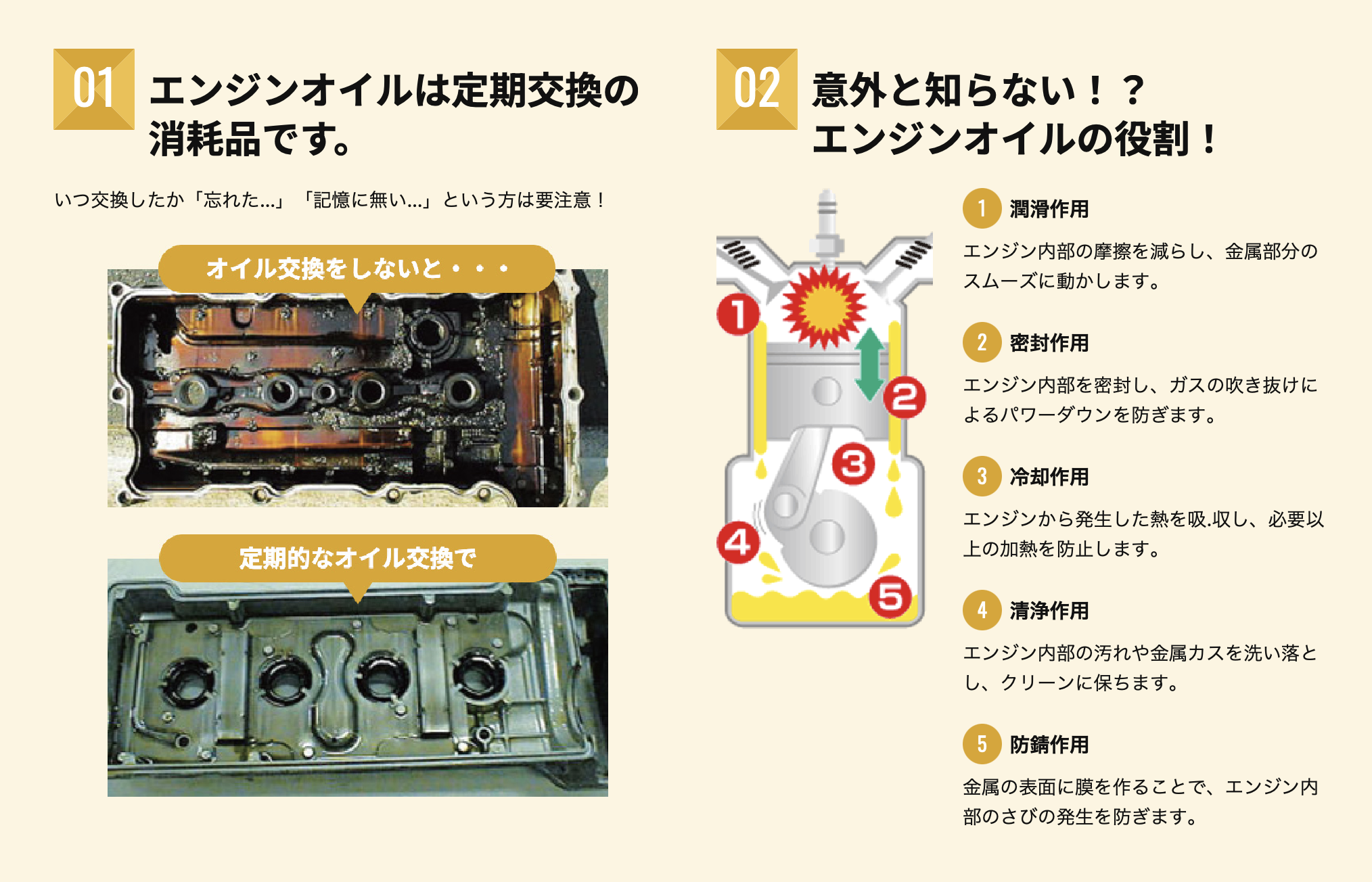 エンジンのノイズや振動が大きくなった、いつもよりパワーが落ちた気がする、エンジンがかかりにくいなどの症状が出たらエンジンオイルの交換サインかもしれません。